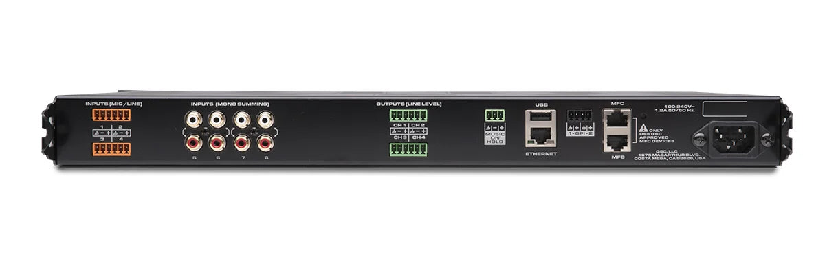 Input processing includes high- and low-pass filters, 4-band parametric EQ, gate, and a dynamics processor, which is switchable between automatic gain control (ACG) or a compressor. Output processing includes priority sources for ducking, auto-loudness, 1/3 octave EQ, limiting, and 12 anti-feedback notch filters with a wizard/assistant to aid in setup. Software applications are available for free. The MP Install app (iOS, Android, Mac, Windows) is used by installers and designers to configure the system. The app can be used online or offline for preconfiguration. The workflow wizard assists you through setup and configuration and includes helping you set up the MP-M series peripherals including the MP-MFC wall controller (sold separately).